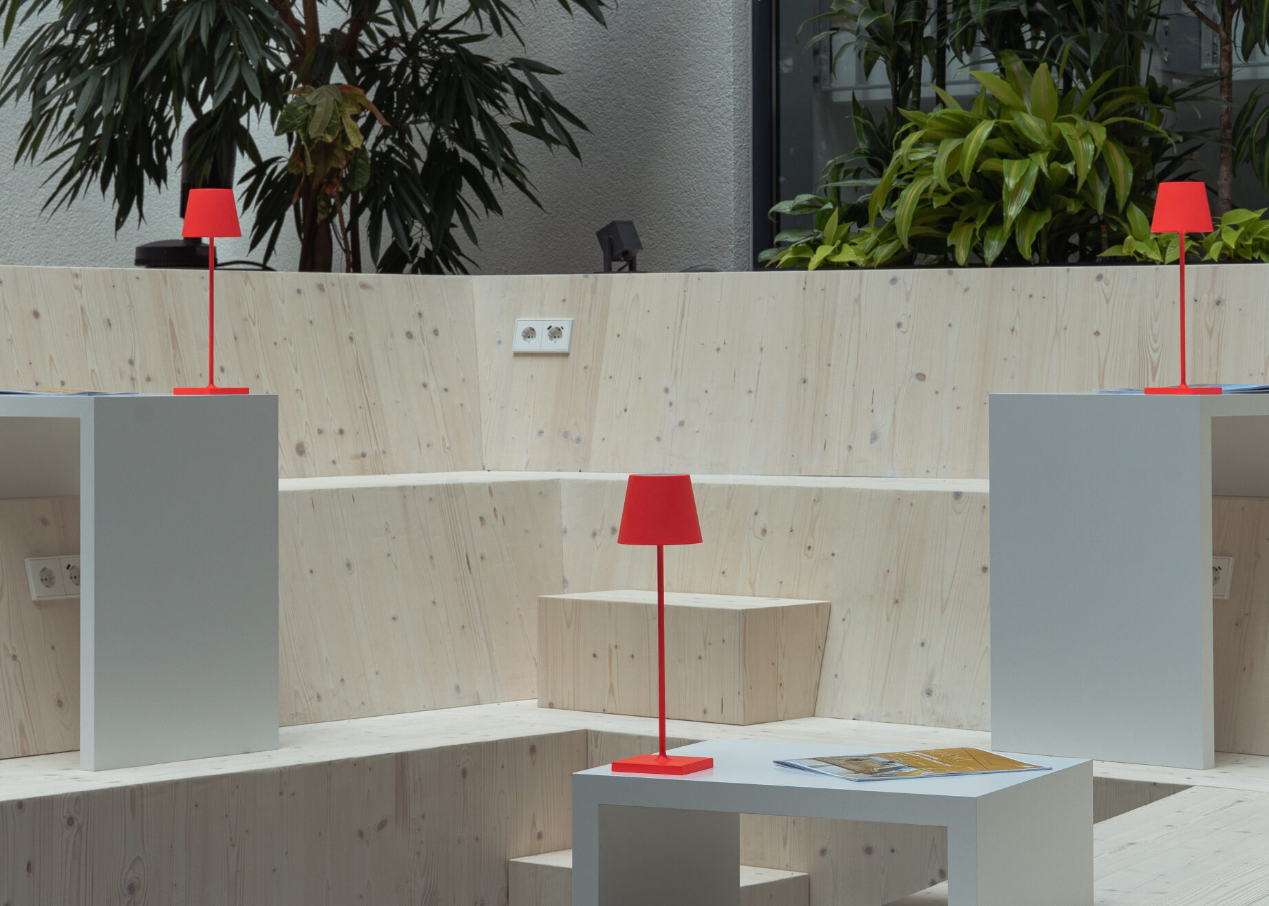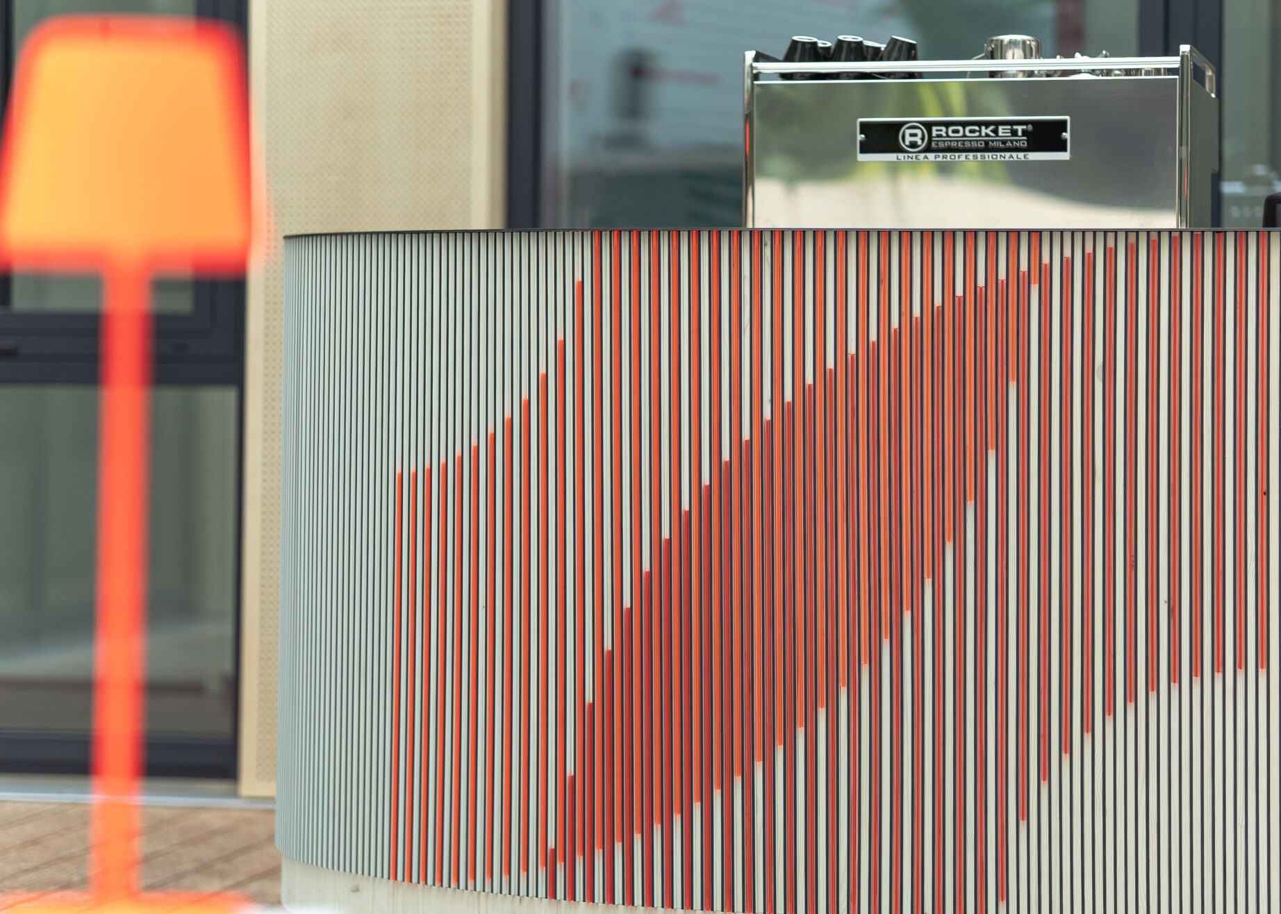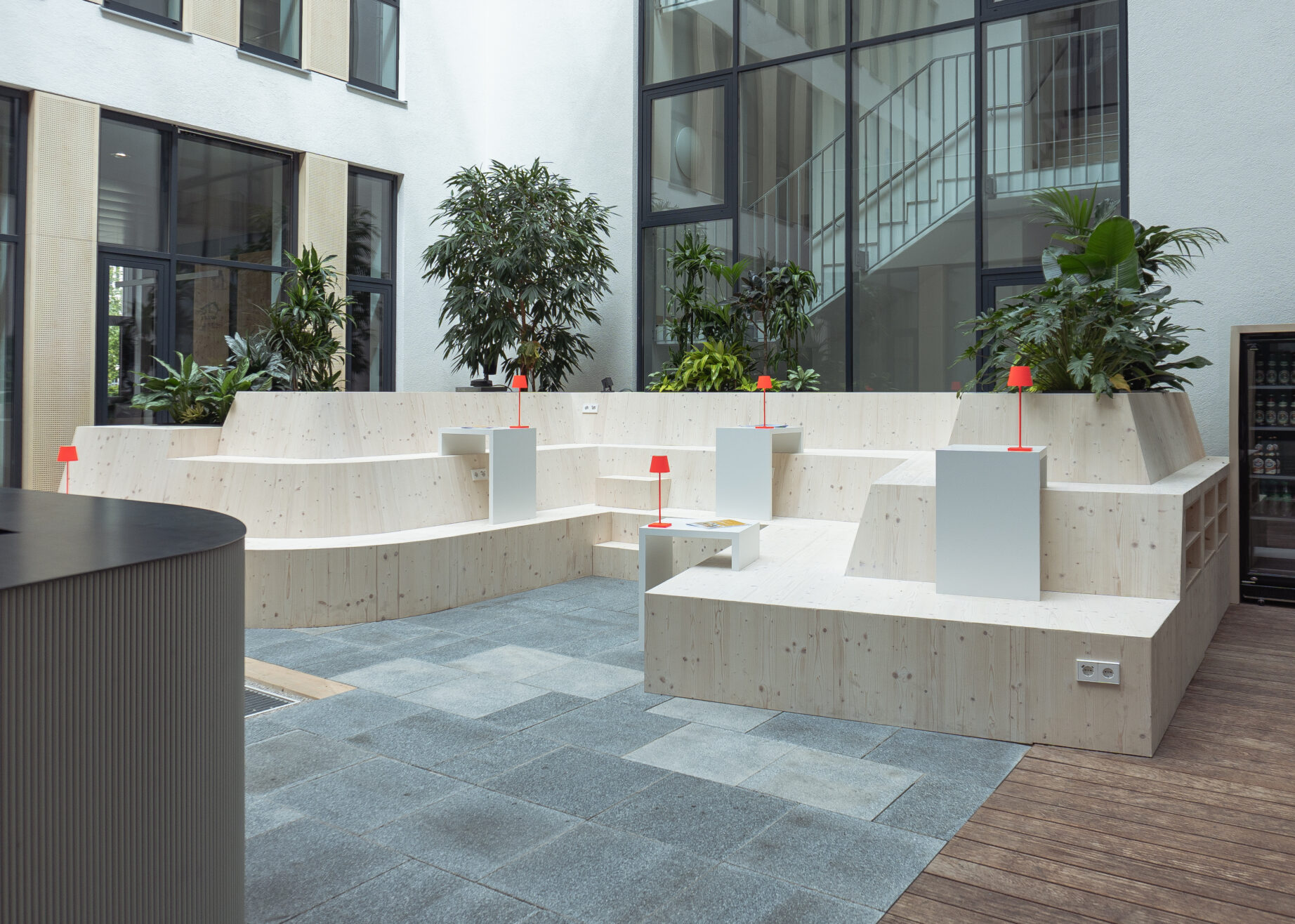 Elegante Kanten, sanfte Rundungen, klare Formensprache. Der neu gestaltete Innenhof wird künftig zum zentralen Treffpunkt des Unternehmens. Durch gezielte Farbakzente und eine harmonische Bepflanzung entstand ein überdachter Bereich, der mit seiner neuen Wirkung zum Highlight im Büro wird. Besonderes Augenmerk lag auf der handwerklichen Präzision, damit jedes individuell gefertigte Element nahtlos in das Gesamtkonzept übergeht. Ein Anspruch, der für unser Team selbstverständlich ist.